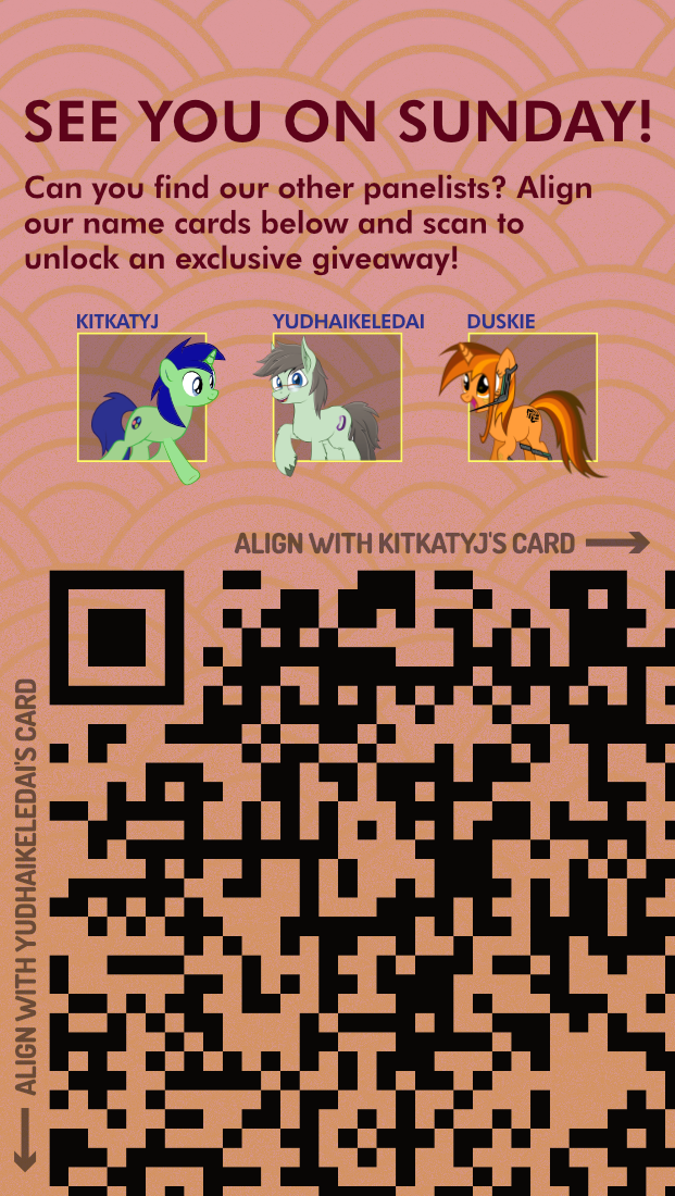 But you'll have to do better than that to actually unlock our secret giveaway! Here's St. Pinkie's portion of the QR code to help you out. Can you find the other panelists? Look out for KitKatYJ, Yudhaikeledai and Duskie as you